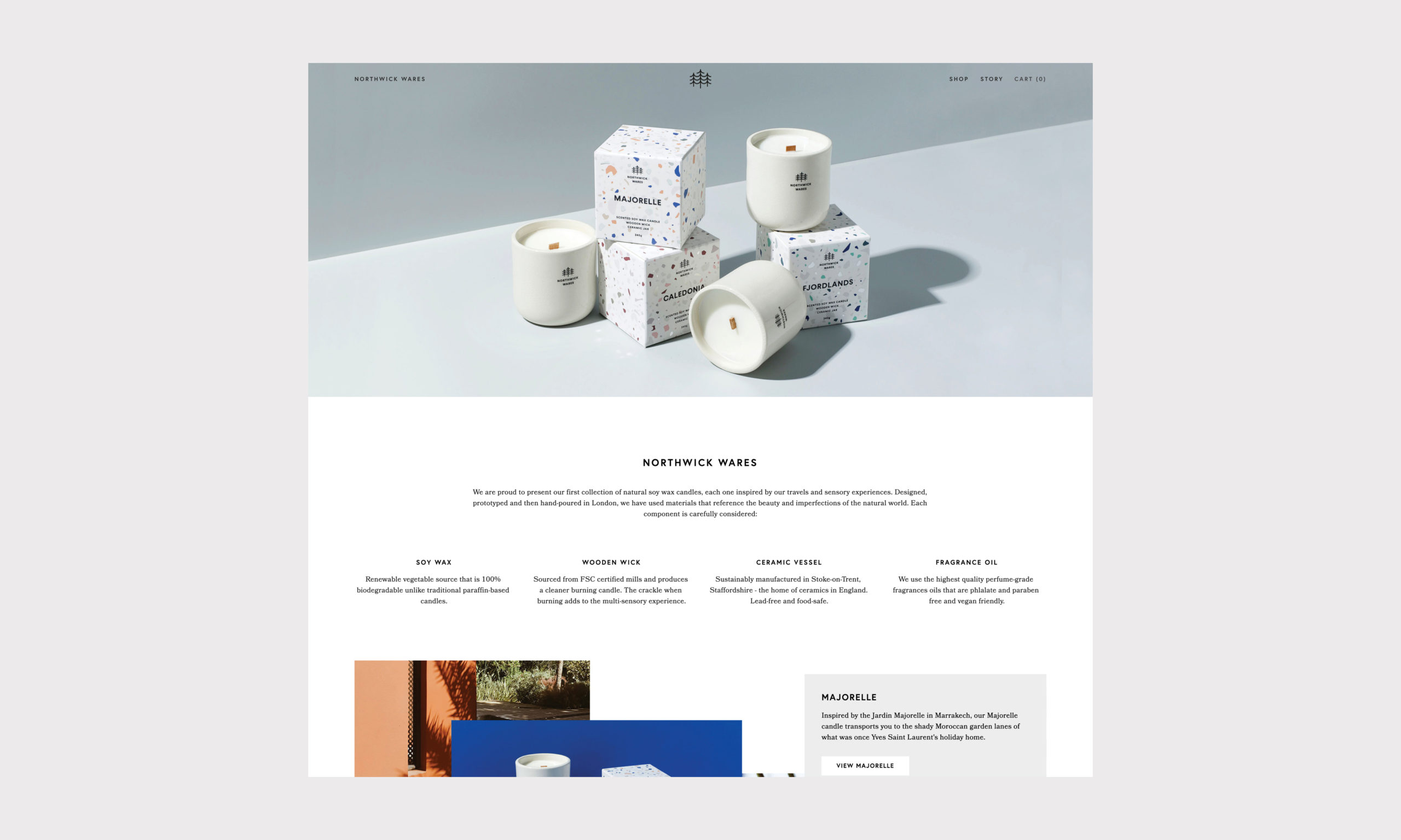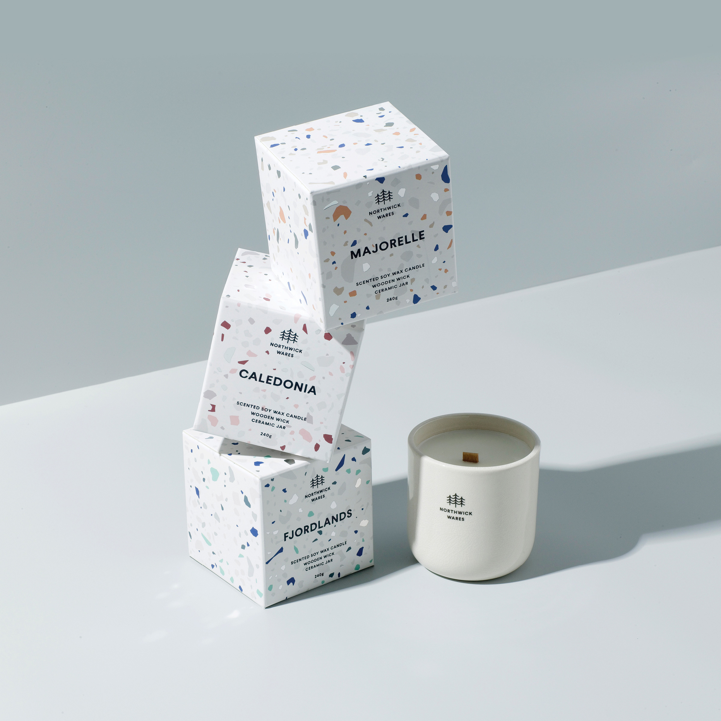 Working closely with the founders we developed the name, brand, packaging, website and photography. With a focus on natural products and the use of wooden wicks and crackled ceramics in the signature candle range, the brand references natural materials at every opportunity. The brand icon uses three trees to support this message while referencing the three founders, and the packaging celebrates the imperfection of the crackle-glazed ceramics with colourful terrazzo patterns that reflect each of the scents.